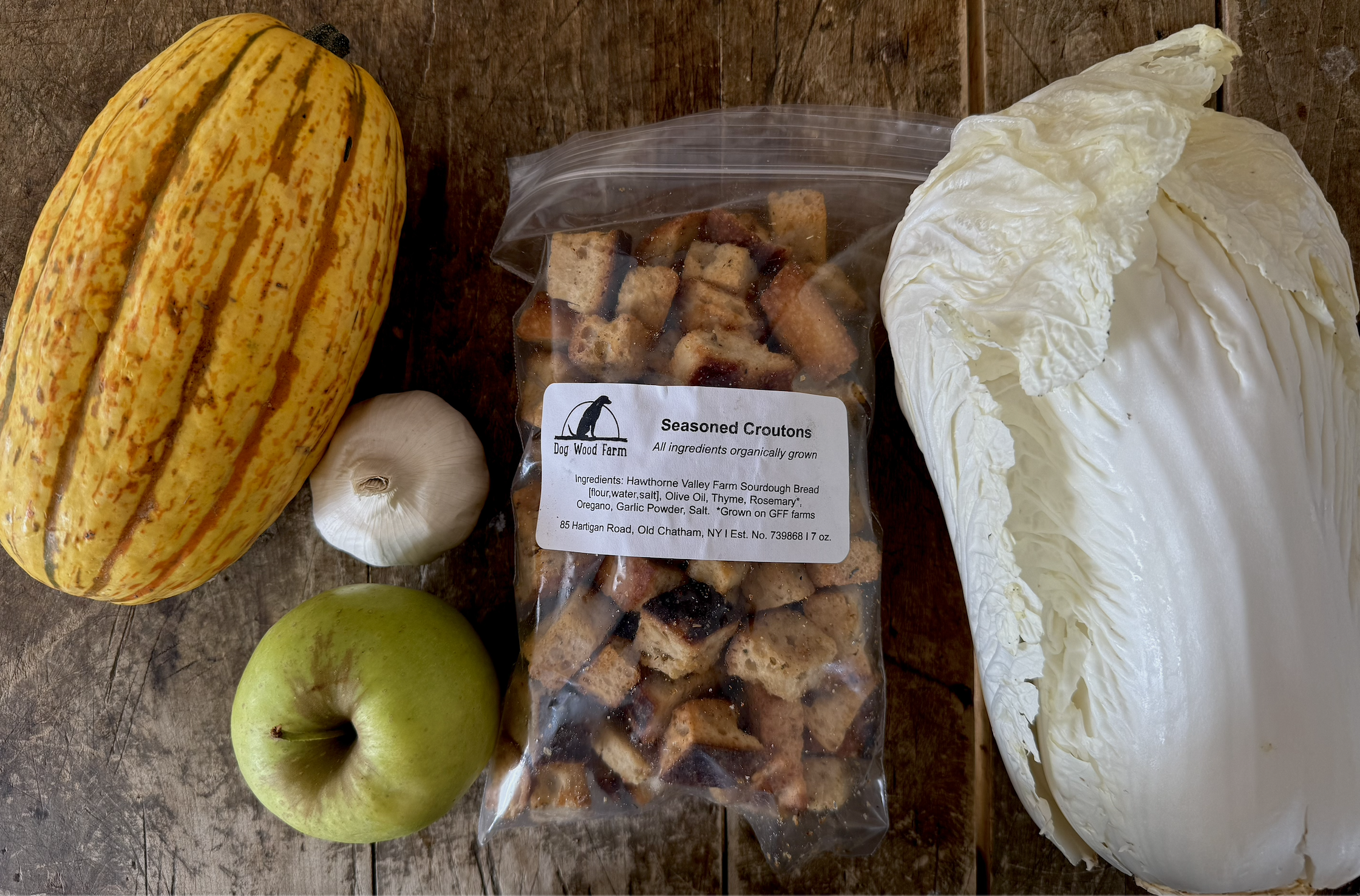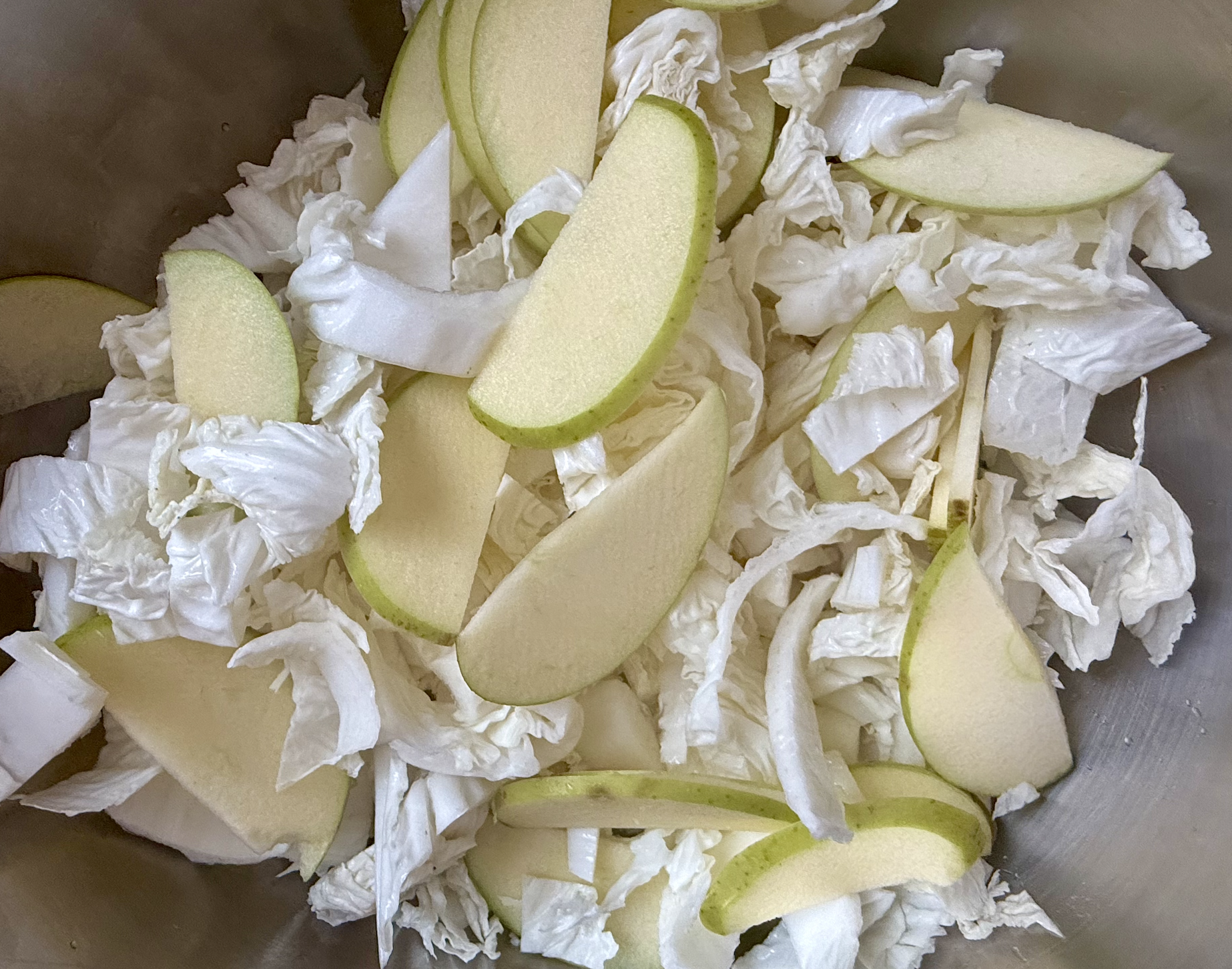 Assemble the salad: In a large bowl, combine Napa cabbage, apple slices, roasted squash, croutons (or walnuts), Parmesan cheese and protein.